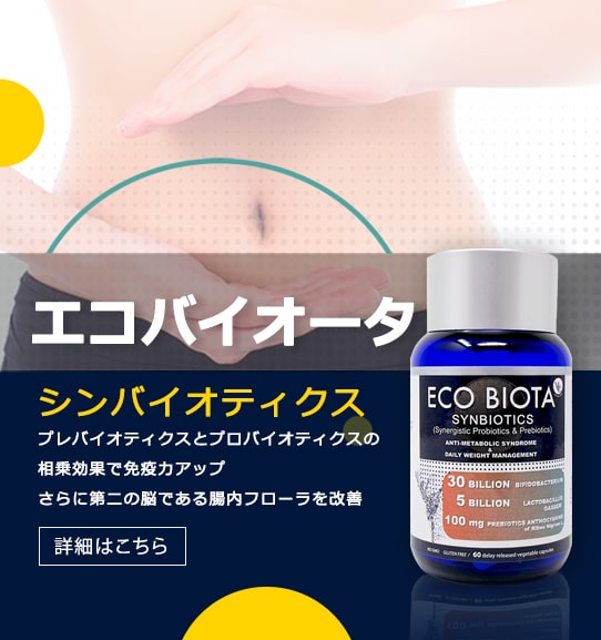 ECO BIOTAに臨床的に配合されているシンバイオティクスは、最新の研究によるプロバイオティクスとプレバイオティクスのパワーを相乗効果的に組成しています。プロバイオティクスとは腸内菌相を整える善玉菌で、ダイエットやメタボリック症候群にも効果的です。プロバイオティクスは、腸内の善玉菌の成長を活性化させる栄養成分であるプレバイオティクスと一緒に摂取すると、特に効果を発揮します。