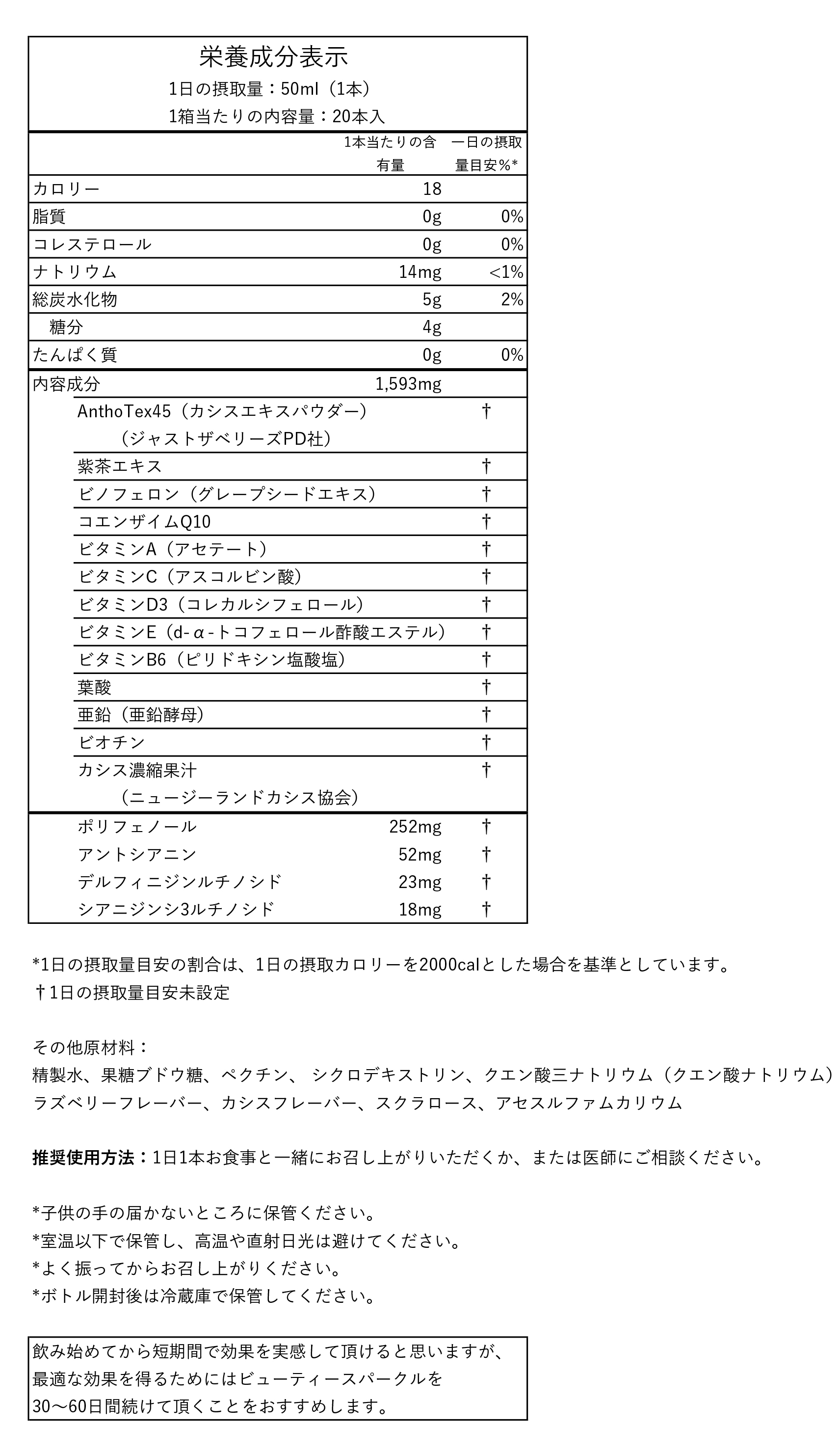 製品に含まれるカシスアントシアニン、グレープシードエキス、マンゴスチン、コエンザイムQ10、アルファリポ酸、レスベラトロルやその他天然成分は、DPPHラジカル消去活性評価、TEAC分析、FRAP分析、ORAC分析、HRSA分析、SRSA分析等、様々な方法で抗酸化力能力を測定し、研究されています。これらの研究結果によって、ビューティースパークルの成分にフリーラジカルを全て除去する強力な抗酸化活性があるこを裏付けています。