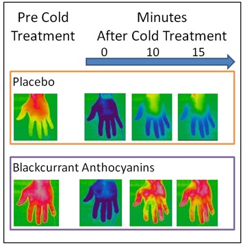 In a clinical study utilizing thermo-imaging, researchers demonstrated Blackcurrant Anthocyanins were able to improved blood circulation. They found, subjects receiving blackcurrant anthocyanins, who placed their hands in ice water, had recovered hand temperature within 10 minutes. Compared with the control treatment group, who’s hands remained cold even after 15 minutes!