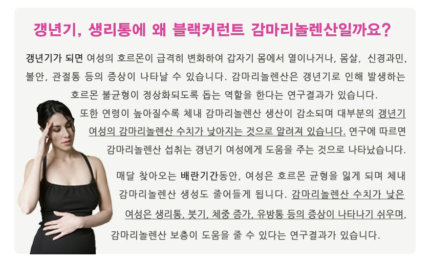 갱년기 여성은 정상인에 비해 감마리놀렌산 수치가 현저하게 낮으며, 이러한 감마리놀렌산 결핍은 갱년기의 호르몬 변화와 염증으로 인한 여러 증상의 원인이 될 수 있습니다. 즉, 감마리놀렌산 섭취는 여성의 갱년기 건강에 도움을 주며, 전세계의 수많은 연구자료가 이를 뒷받침하고 있습니다.