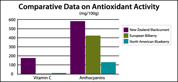 베리들이 항산화제가 풍부한 식품으로 각광을 받고 있습니다. 하지만 여러 베리들 중에서도 블랙커런트의 항산화제 파워가 아래의 도표에서 보이는 것처럼 가장 강력한 것으로 나타났습니다. 세계적으로 잘 알려진 뉴질랜드 정부 산하 연구기관인 호트연구소(HortResearch Institute)에서 진행된 항산화제 성분 비교실험(아래 도표 참조)에 의하면, 블랙커런트는 블루베리나 빌베리보다 뛰어난 효능을 보여주고 있습니다.