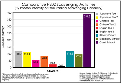 抗氧化能力極為高的茶,藍莓,黑醋栗等萃取物進行了自由基(H2O2)除去能力試驗,結果表明,黑醋栗花青素的抗氧化能力,消除自由基(H2O2)能力最強。它比藍莓要多出3倍之高。